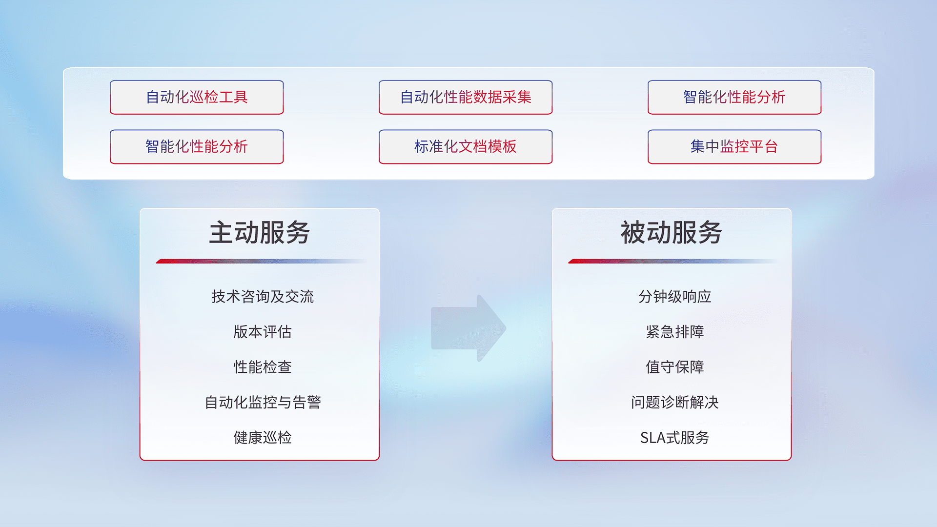 智能化工具和标准化文档,,,,保障服务质量,,,提供主动服务(包含技术咨询、、、、版本评估、、、、性能检查、、、自动化监控与告警、、、健康巡检)和被动服务包含(分钟级响应、、紧急排障、、、值守保障、、、、问题诊断解决、、、SLA服务)。。。